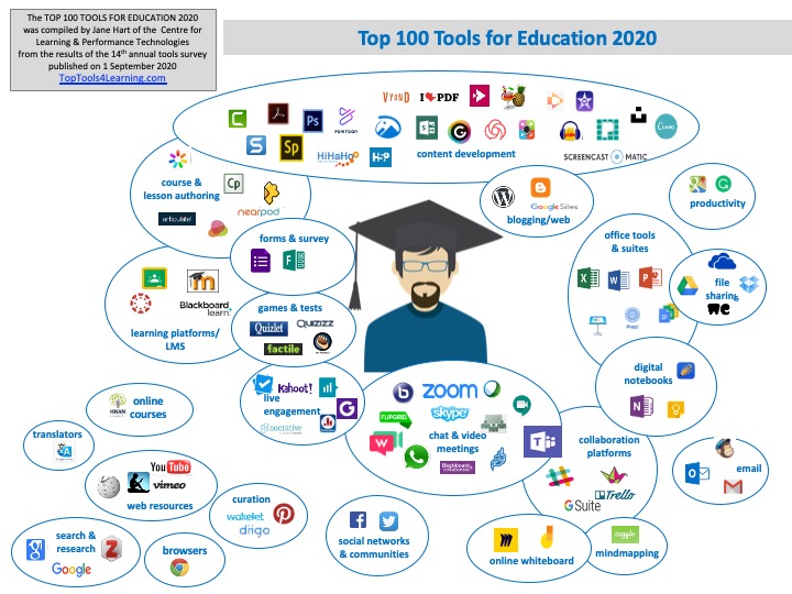 Jane Hart tarafından hazırlanan 2020 yılına ait "Eğitimde En Çok Kullanılan 100 Araç" listesi aşağıda yer almaktadır.